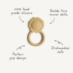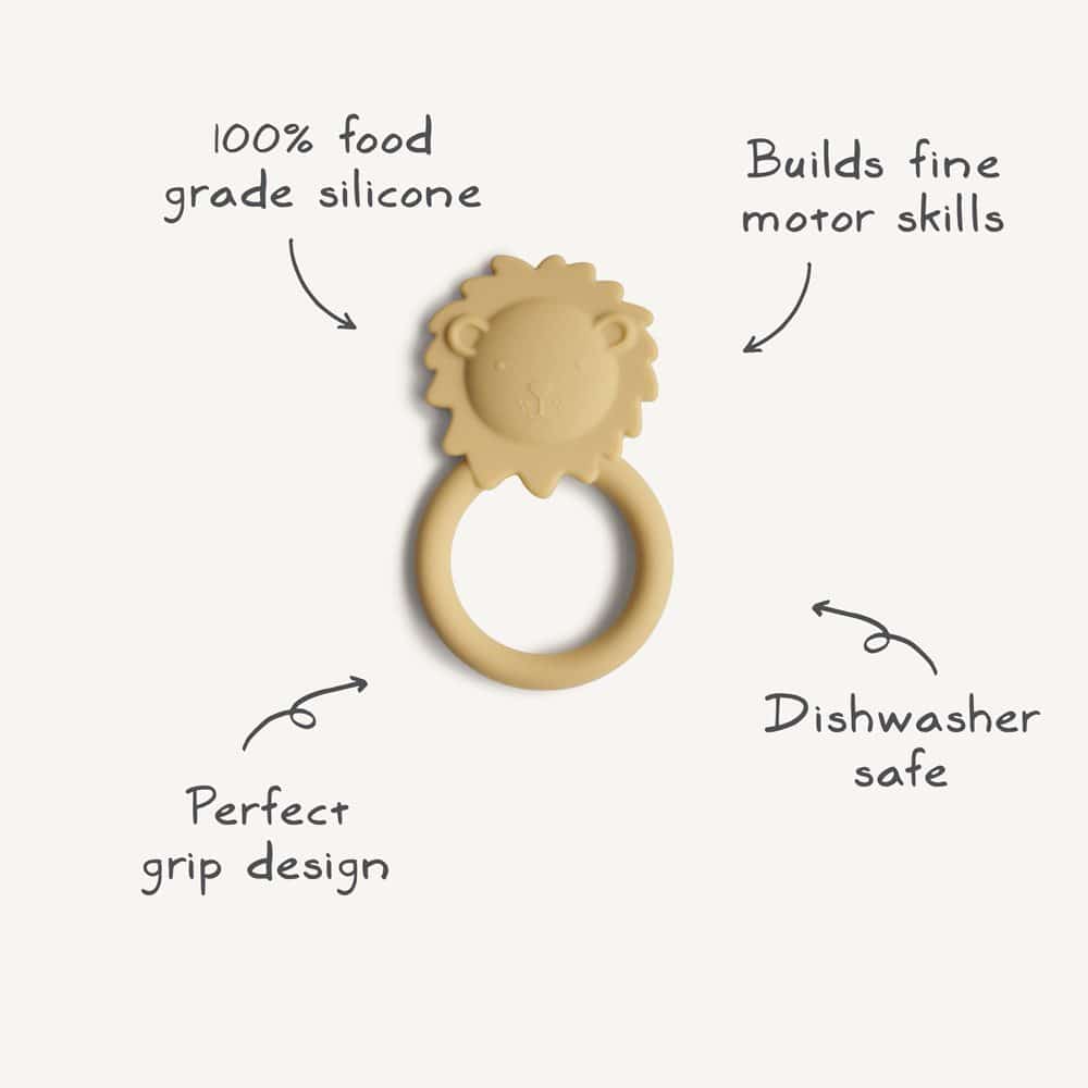 Roztomilé hryzadlo v tvare levíka je vyrobené z potravinárskeho silikónu a je vysoko odolné a ľahko sa čistí. Hravý dizajn podnecuje predstavivosť a kompaktná veľkosť uľahčuje držanie pre malé ručičky