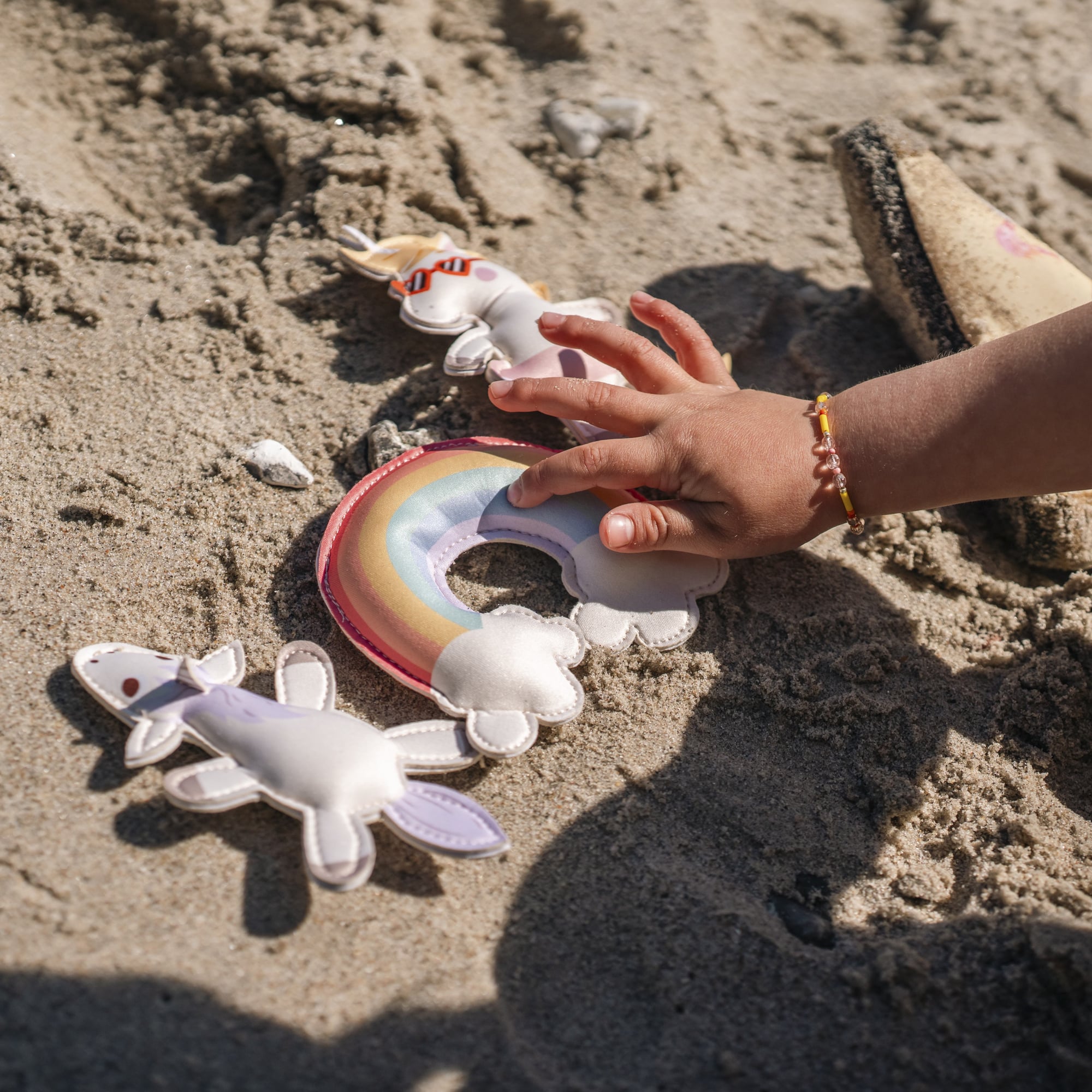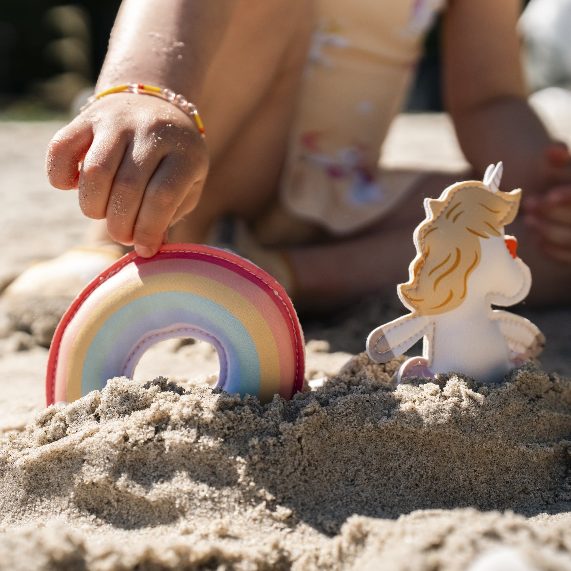 V tomto čarovnom sete sa stretnete s dvoma pôvabnými jednorožcami a farebnou dúhou – pripravenými potápať sa, plávať a točiť sa vo vode. Každá figúrka sa vo vode pohybuje svojím vlastným spôsobom: niektoré klesajú, iné plávajú – no všetky podnecujú zvedavosť a pozývajú k hre, objavovaniu a úžasu. Vďaka jemným pastelovým farbám a hravým tvarom premenia figúrky každé kúpanie na snový svet plný fantázie a pohybu.