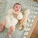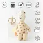 Mäkká bavlnená plyšová žirafka je šetrná k detskej pokožke a vo vnútri má senzorické guličky, ktoré stimulujú zmysly. Obsahuje hryzadlovú ruku na masáž ďasien a šuštiace nožičky pre sluchovú a hmatovú stimuláciu – ideálny kamarát na upokojenie. Pre jednoduchú údržbu je možné ju prať v práčke.