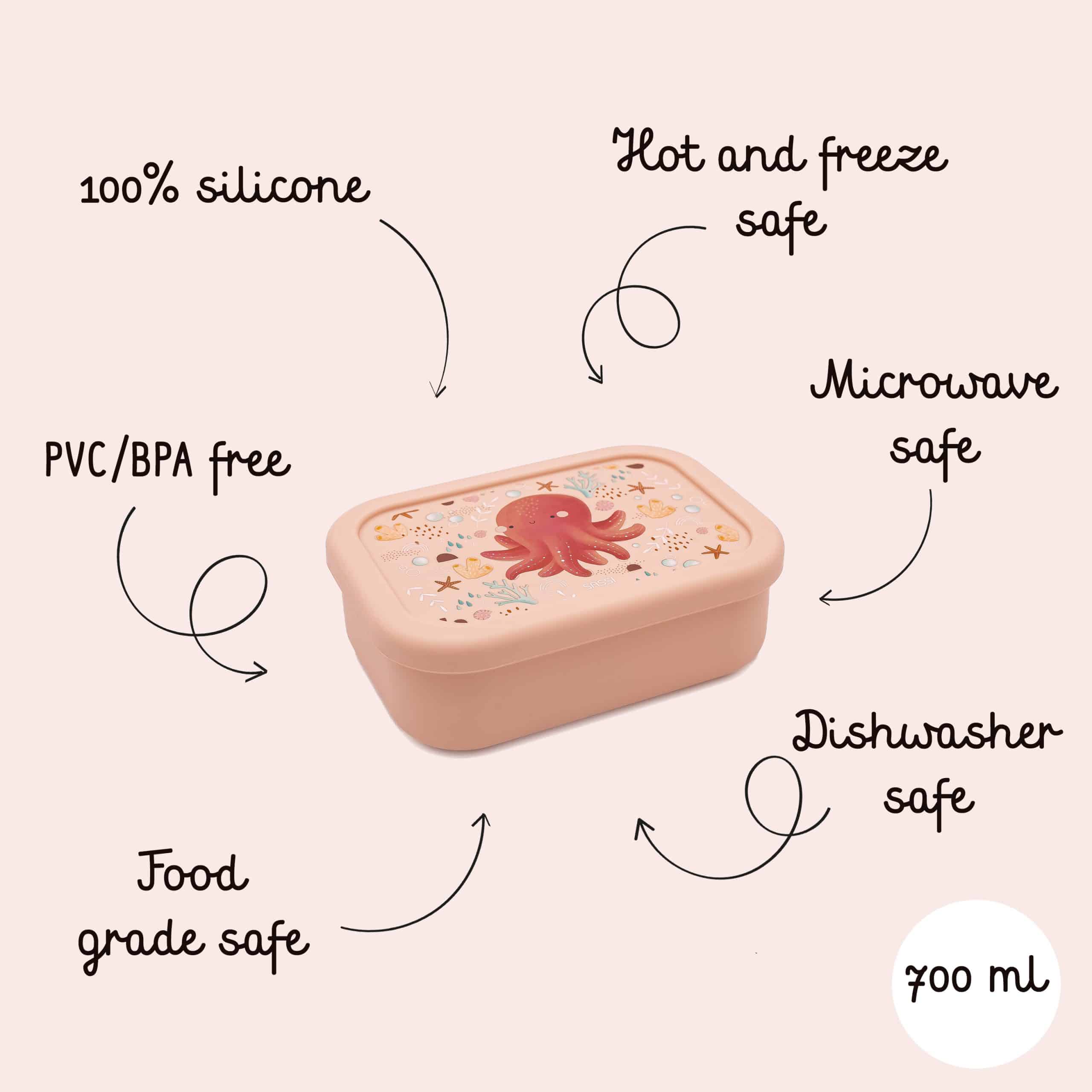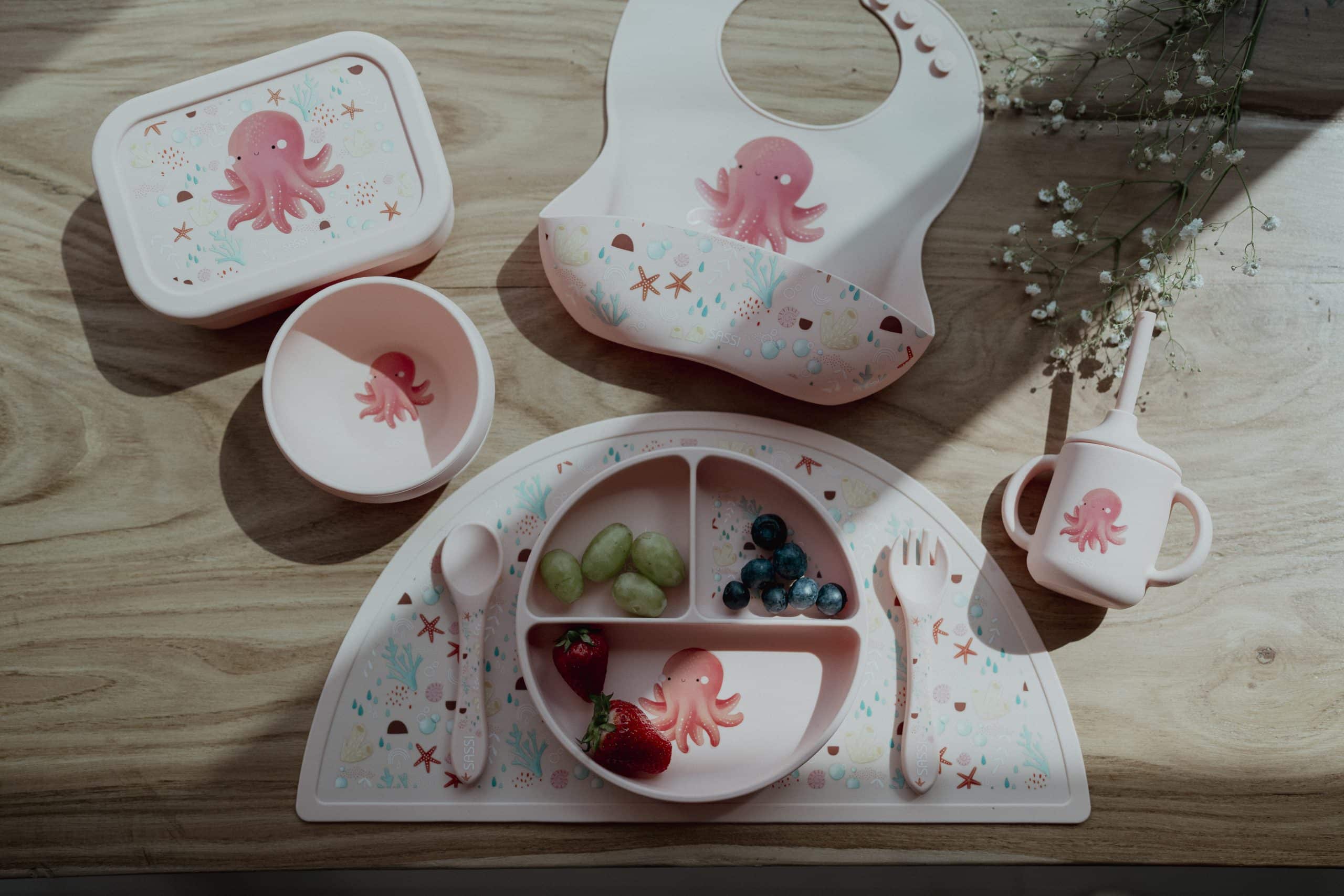 Vyrobené zo 100 % potravinárskeho silikónu. Jedálenské súpravy SASSI neobsahujú škodlivé chemikálie ako BPA, PVC a ftaláty, čím zaručujú, že jedlo vášho dieťatka bude podávané v čo najčistejšom a najbezpečnejšom prostredí. Mäkká a hladká štruktúra silikónu robí každý kúsok príjemným na dotyk, zatiaľ čo pružnosť materiálu zaisťuje odolnosť voči nevyhnutným nárazom a pádom, ktoré sprevádzajú detské stolovanie. Naše silikónové výrobky spĺňajú prísne bezpečnostné normy EN14372.