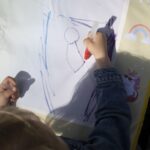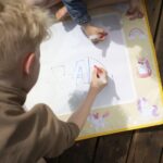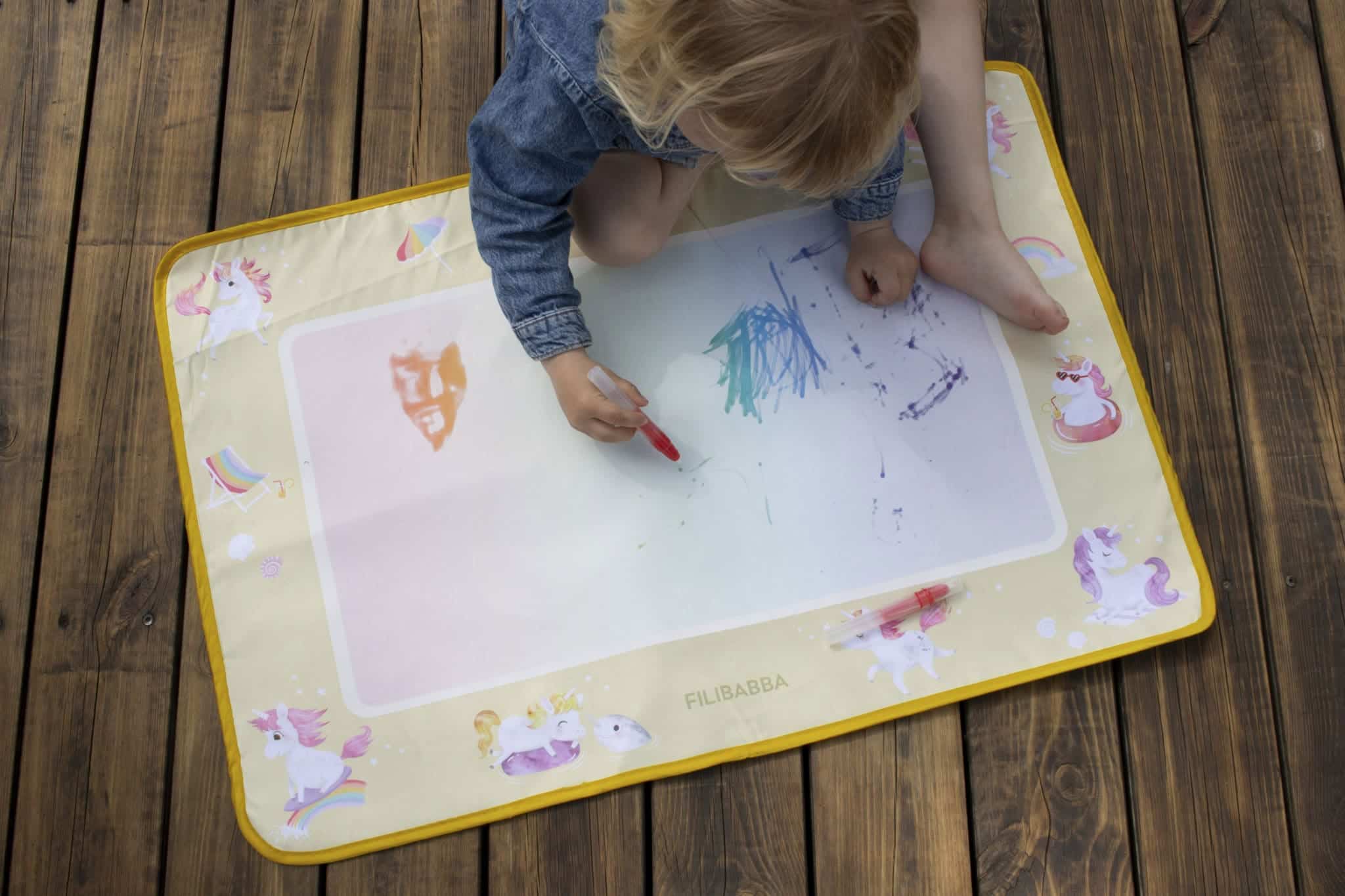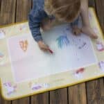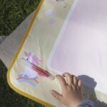 Podložka je dostatočne veľká na to, aby na nej mohli kresliť dve deti naraz. Keď kresba uschne, povrch je opäť pripravený na nové umelecké dobrodružstvá. Je ľahká a jednoducho skladateľná s praktickým popruhom – ideálna na doma aj na cesty, od obývačky až po slnečný piknik.
